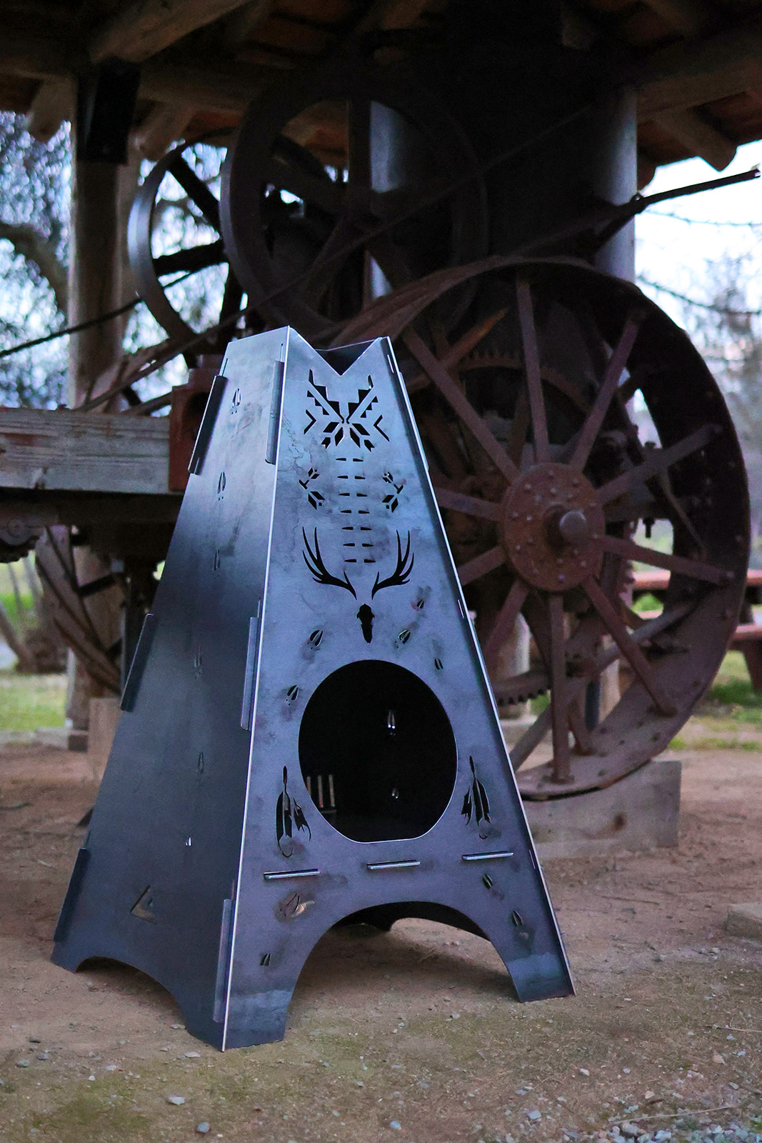 SpirePit™ Custom lets you turn our heavy steel chiminea fire pit into a one-of-a-kind centerpiece with your own artwork, logo, or branding cut into the panels.